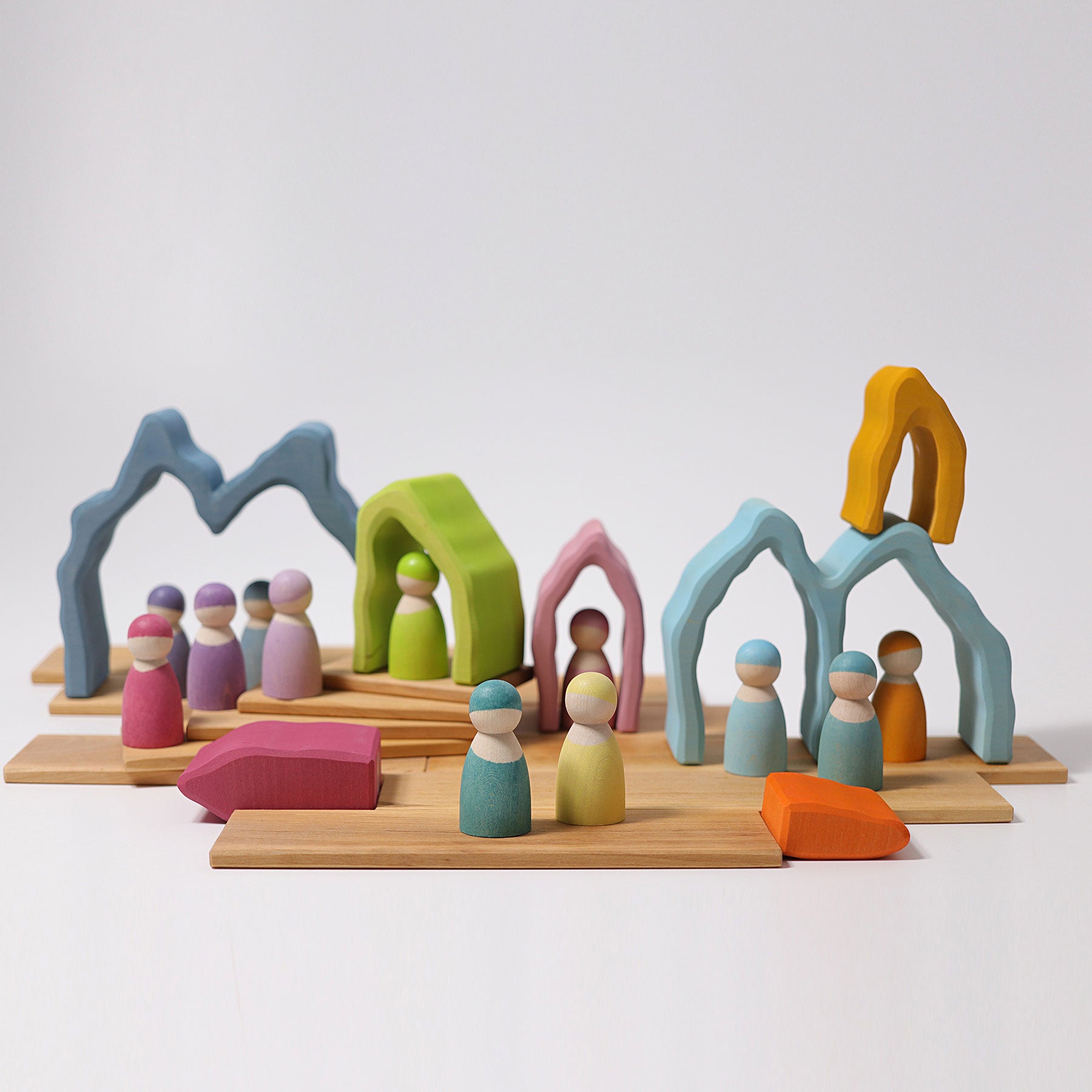 The Cave Arch is really versatile: the children stack and sort or they will use it as fence for animals, as house for dwarfs and dollhouse dolls, build amazing sculptures or a underwater world... this toy will always be integrated in playing with a lot of fantasy. 7 pieces.