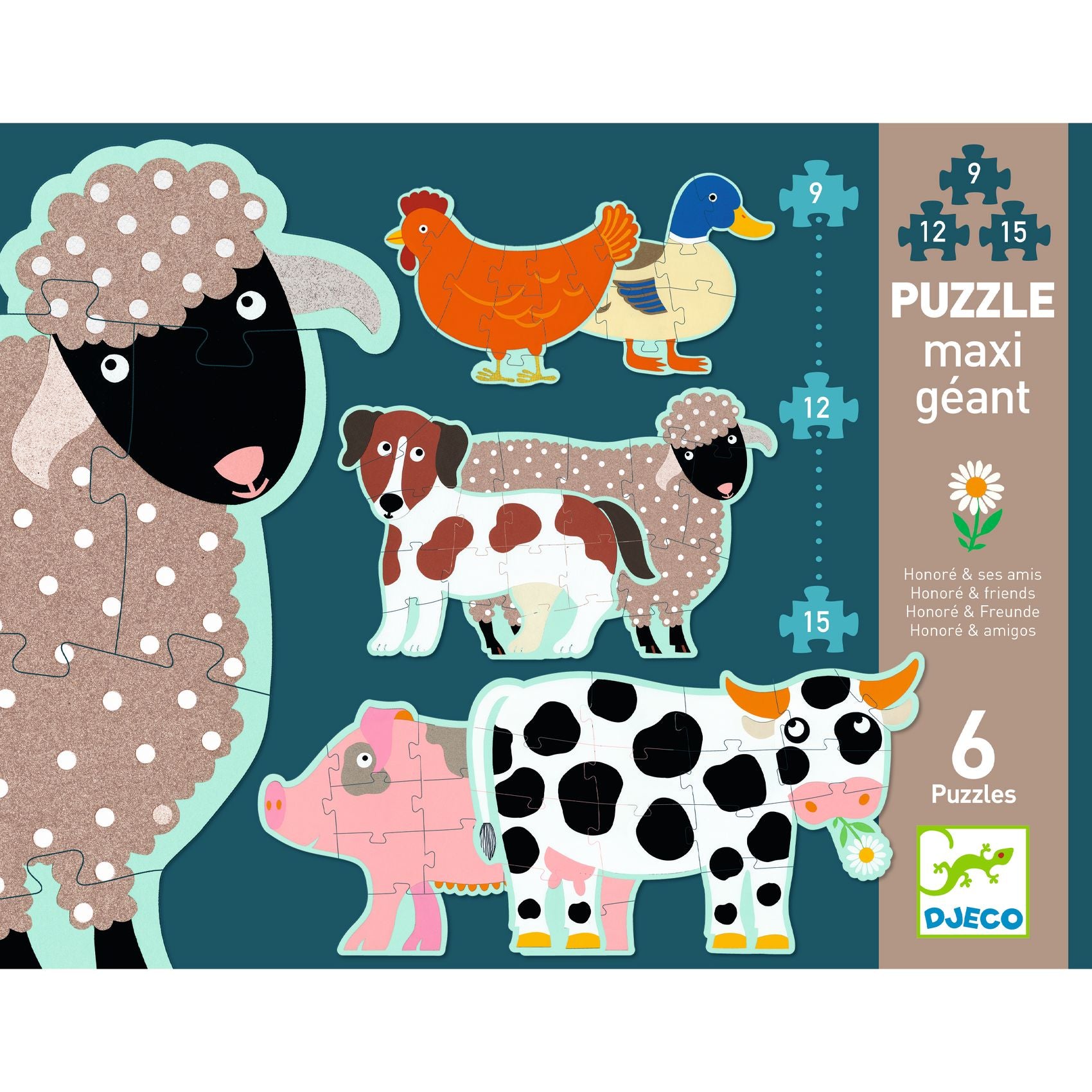 “Honoré & friends” is a set of 6 giant 9-, 12- and 15-piece progressive shaped jigsaws. Children piece together the different farm animals: a chicken, a duck, a dog, a sheep, a pig and a cow. Once completed, children place the jigsaws on top of each other to create a tall 1.40 m pyramid.