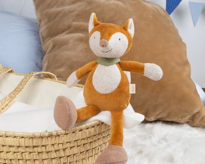 Even though this plush fox has a length of 32 cm, it is a super soft lightweight that can easily be carried around by its little owner all day long. All various shell materials are made of soft cotton, even the contrasting jersey neckerchief (that is partly stitched on). Eyes, mouth and whiskers are delicately embroidered. Due to the design features and the materials, the pliant soft toy lion is a wonderful snuggle companion already for babies and very young children.